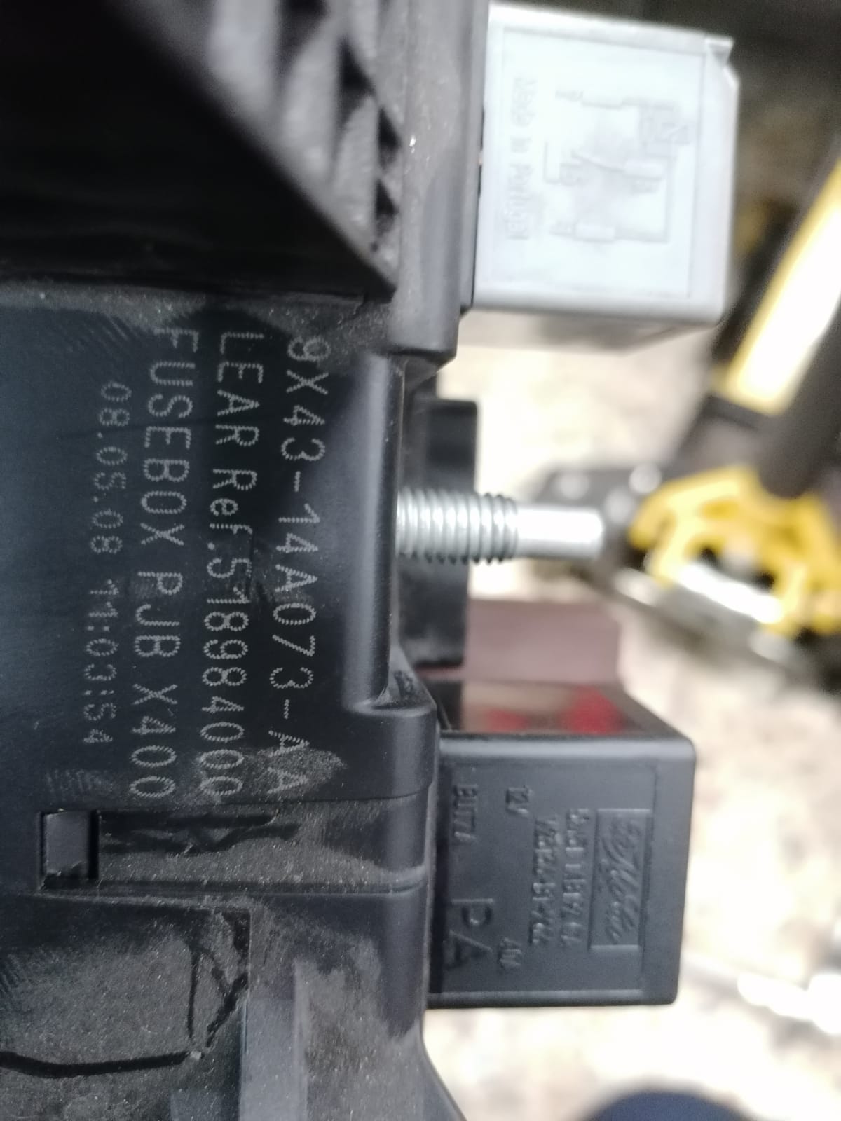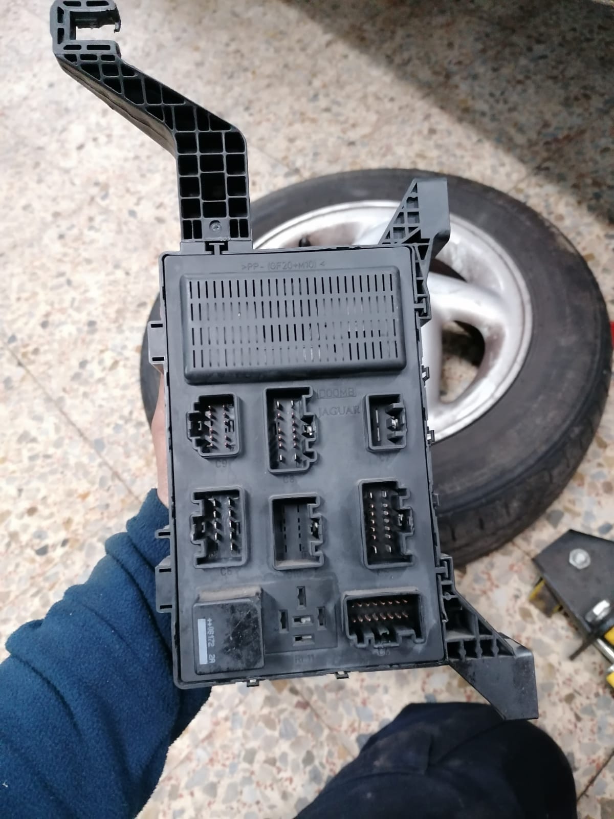 Una vez que la tienes desmontada, es conectar de nuevo todos los cables, trasladar los fusibles (haces fotos antes de quitar ninguno para volver a ponerlos en el mismo orden) y abres el manual eléctrico 2008 del X-Type en la página 20 del lector de PDF y ahí tienes la disposición mecánica. Ojo que esa tarjeta que tienes en la mano y has puesto la foto, por su cara inferior, tiene 5 conectores gordos (el sexto no parece tener patilla alguna) y coincide con el esquema de la página 35 del manual eléctrico.