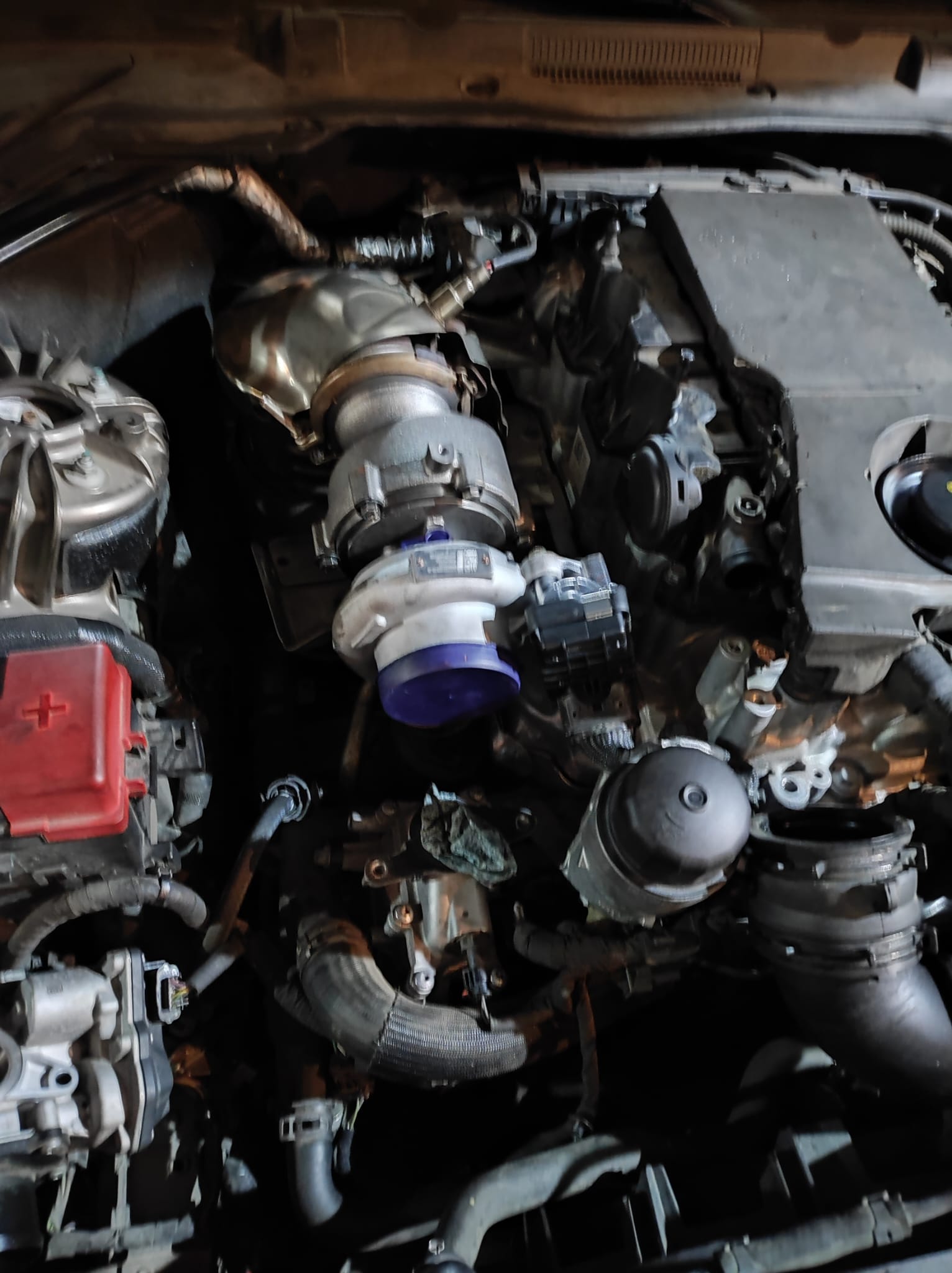 No es nada complicado quitar primero la EGR y las chapas anti calóricas accedemos al turbo que son tres tornillos más una brida más el tubo de aceite, recomiendo quitar los espárragos completos del turbo para poder montarlo con mayor seguridad.
