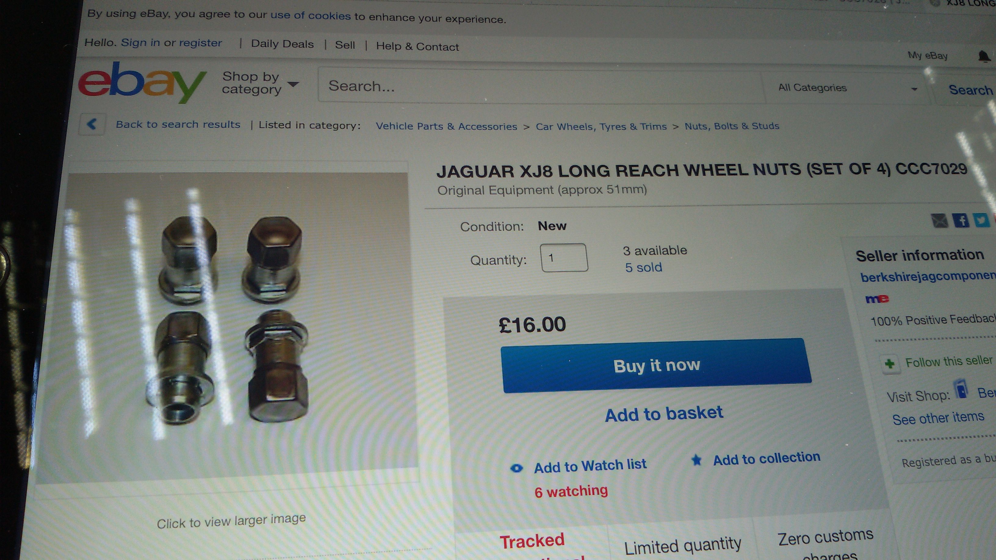 Un tema curioso, es que la llanta de acero y tapacubos lleva unas tuercas de asiento cónico y las llantas Kiwi piden tuercas de asiento plano. Así que compré en ebay un juego "nuevo" por unos 105€. Es caro, pero tened en cuenta que la casa Jaguar pide aprox unos 20€ por tuerca... (saldrían unos 400€).