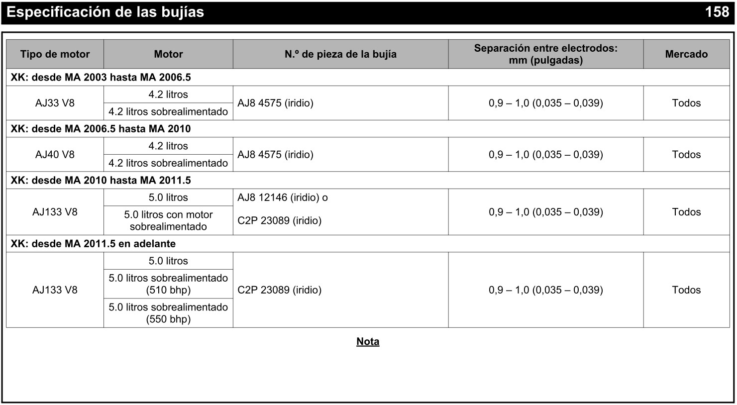 Las bujías a instalar, según manual de especificaciones de vehículos Jaguar, son las siguientes: Según el manual de taller del XK de 2010: Saludos