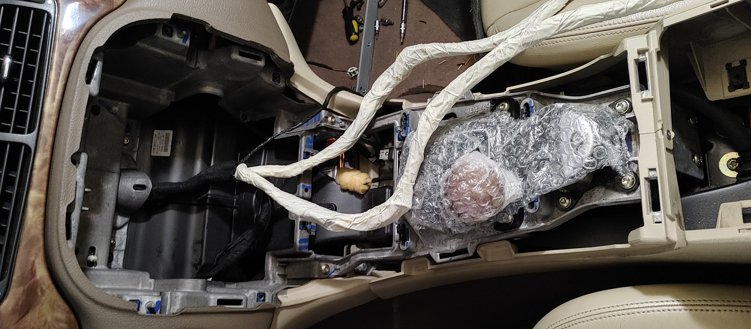 Buscando otro sitio se me ocurrió que debajo del reposabrazos central podría ser el sitio ideal y asi lo hize y como antes dije con un poco de maña el resultado es espectacular. Para llevar los mandos del clima al hueco bajo el reposabrazos central hay que prolongar el cableado del clima desde el salpicadero hasta el reposabrazos, unos 60 cms de 41 cables fino en varios colores de 60 cms de largo (prolongar cortando y pegando, con el polo negativo de la bateria desconectado.
