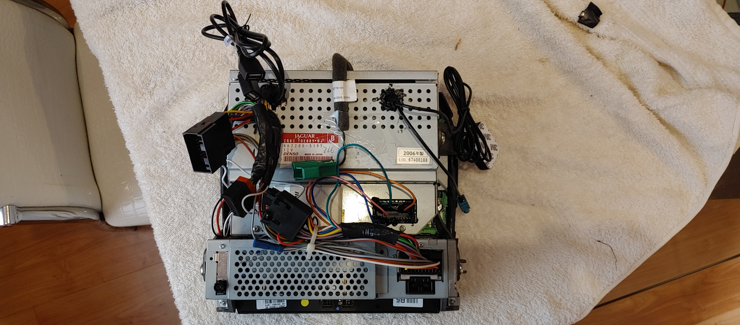 Buenas tardes después de mirar y buscar en varios foros respecto al cambio de radio-cd a pantalla original de jaguar para mi jaguar S type de 2005, en los que decían que era imposible hacer el brico porque le faltan muchos elementos (unidades ópticas, cableados y configuraciones de las ECUS). En fin después de leer sobre la dificultad de montar todo el tinglado y el coste de todas las piezas (Dvd de navegación, Pantalla, Unidad de clima, cableado etc.) pensé en seguir con el equipo de radio + clima que trae mi gato y tiré la toalla en principio. Pero la faena era que por mi ignorancia de la incompatibilidad del montaje ya me había comprado una pantalla original del un jaguar Stype del año 2006 en ebay de Reino Unido. En verdad tampoco era grande la perdida por que solo me costo 70 euros y estaba impecable.